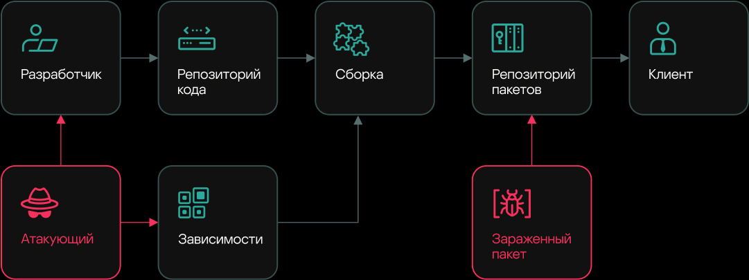Атаки на цепочку поставок — это проникновение в инфраструктуру компании с помощью стороннего ПО или поставщика, у которого есть доступ к цифровым системам. |