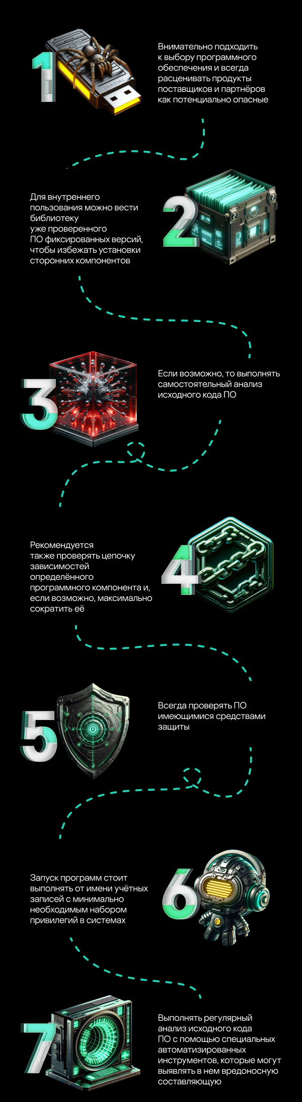 Как отмечалось выше, предотвращать атаки на цепочки поставок очень сложно, в любой компании применяется множество программных средств, с десятками зависимых компонентов, и в каждый из них может быть заложен вредоносный компонент в любой момент времени. Сократить такие риски можно, если придерживаться следующих общих правил: |